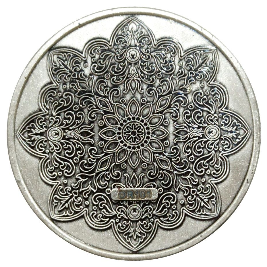 Опис: На зворотному боці монети зображено детальний візерунок, багатий на симетричні квіткові та геометричні мотиви, що розходяться від центральної точки. Цей складний дизайн відображає гармонію, духовну зосередженість та медитативні аспекти східного мистецтва.