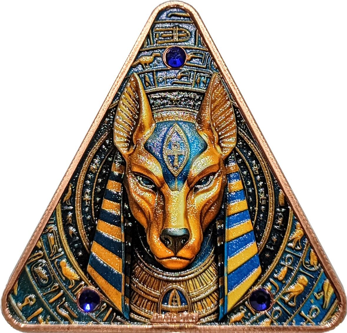 Опис: На аверсі монети зображено вражаючий трикутний малюнок із Анубісом, давньоєгипетським богом загробного життя. Анубіс, виконаний у насичених металевих тонах з королівсько-синіми акцентами, зображений у королівському головному уборі на детальному ієрогліфічному тлі. Три вставлені сині дорогоцінні камені підкреслюють красу монети, створюючи вражаючий і містичний візуальний центр.