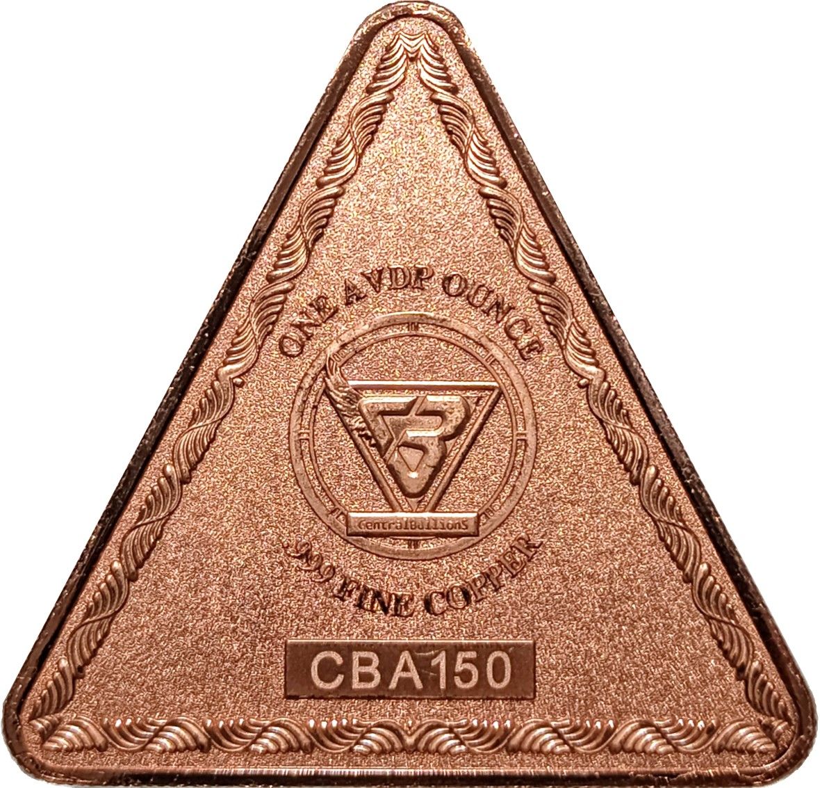 Опис: На зворотному боці зображено трикутний емблему Central Bullions разом з написами: «ONE AVDP OUNCE – .999 FINE COPPER» (Одна унція AVDP – 999 проба міді) та унікальний серійний номер для підтвердження автентичності.