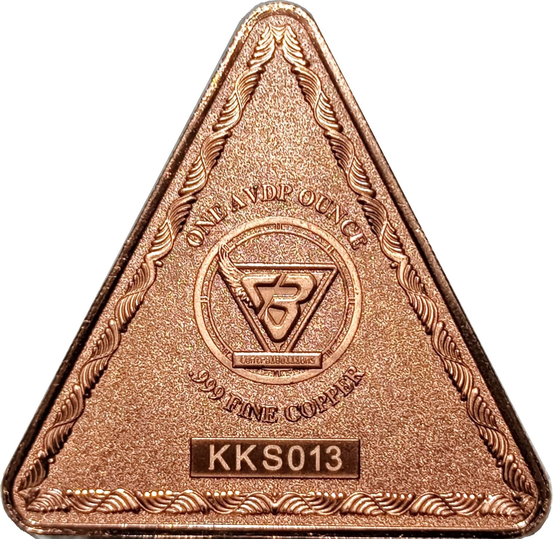 Опис: На зворотному боці зображено емблему Central Bullions — виразний монограма CB, оточена трикутним щитом, підкреслена мотивом крил. Трикутна облямівка продовжує орнаментальний дизайн, віддзеркалюючи елегантність аверсу.