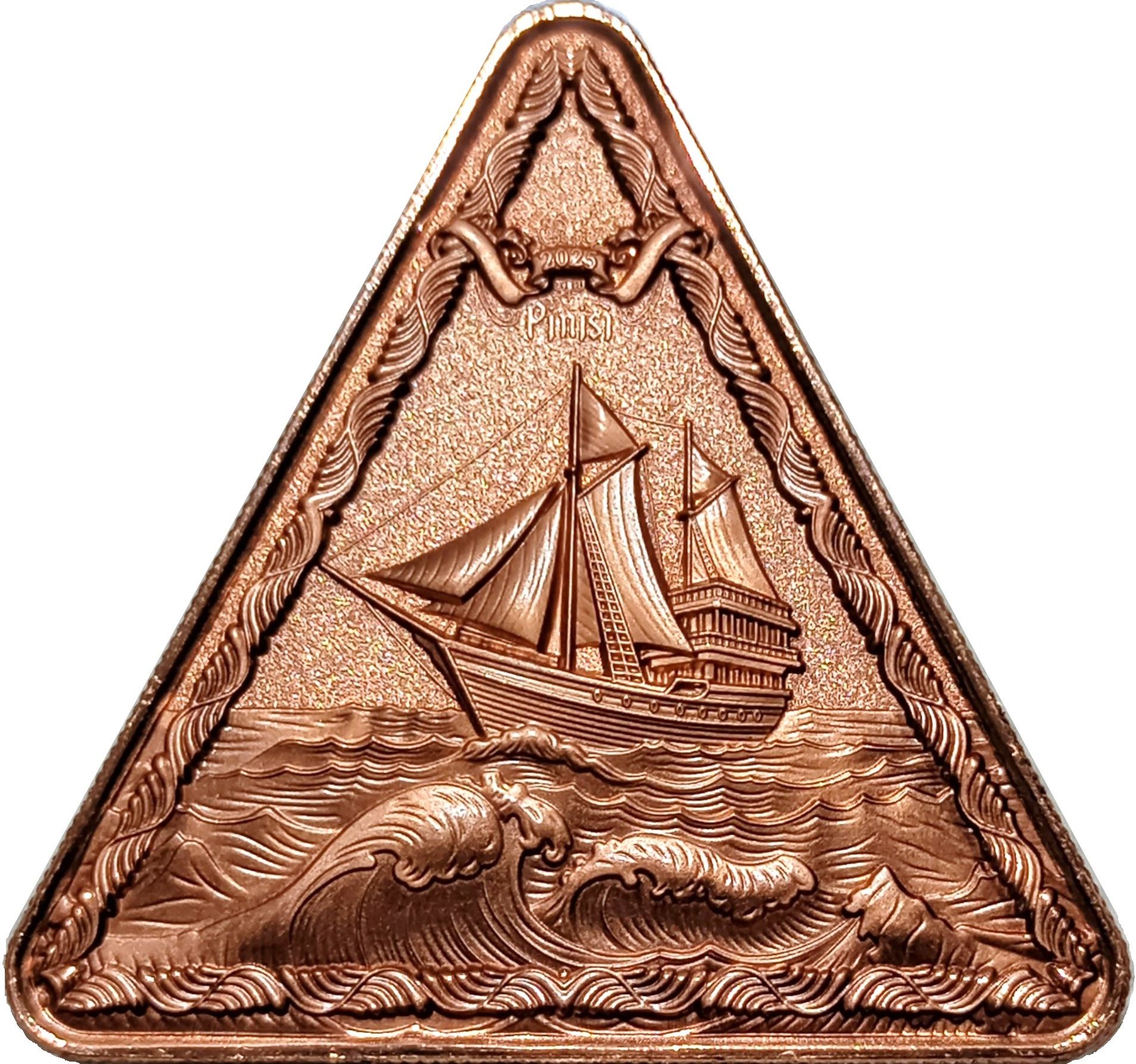 Опис: Ця медаль трикутної форми викарбувана з чистої міді вагою 1 AVDP унція і присвячена традиційній морській спадщині індонезійського архіпелагу. На аверсі зображено Пінісі, знаковий двощоглове вітрильне судно народу Бугіс-Макассар з Південного Сулавесі, Індонезія. З високим такелажем і розгорнутими вітрилами пінісі зображений на океанських хвилях, символізуючи стійкість і дух досліджень. Це судно давно є символом морської культури та майстерності Індонезії, визнаним ЮНЕСКО частиною нематеріальної культурної спадщини світу. Стилізовані хвилі та вишукані орнаменти обрамляють корабель, підкреслюючи його морську міць.