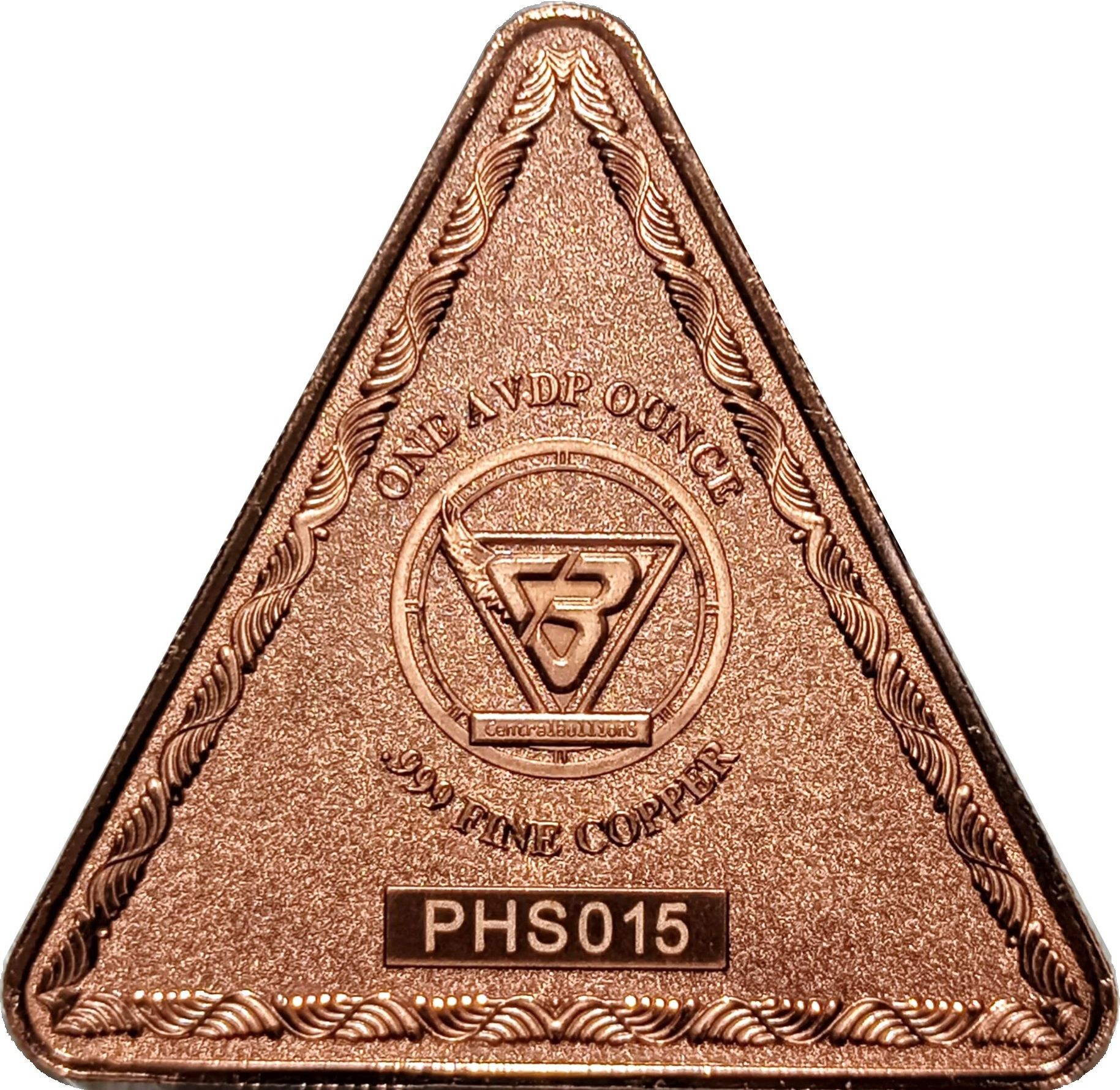 Опис: На зворотному боці зображено емблему Central Bullions — виразний монограма CB, оточена трикутним щитом, підкреслена мотивом крил. Трикутна облямівка продовжує орнаментальний дизайн, віддзеркалюючи елегантність аверсу.