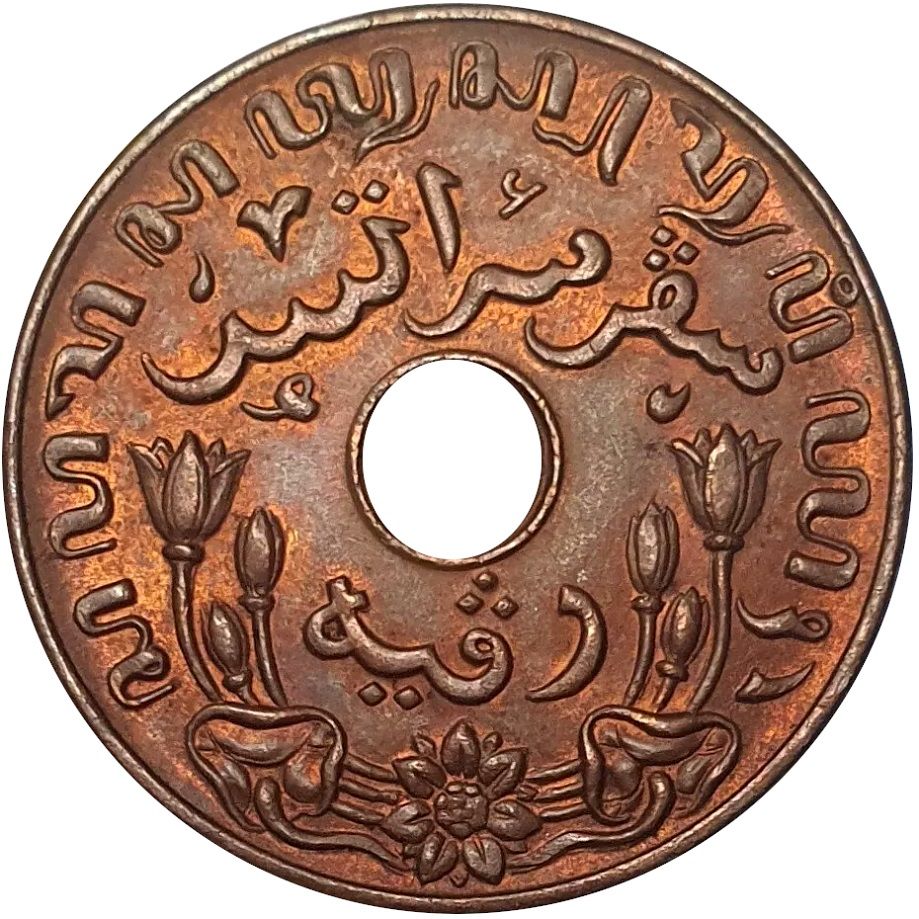 Опис: Квіткові елементи внизу, легенда яванською мовою по краю та малайською мовою в явіському письмі навколо центрального отвору.