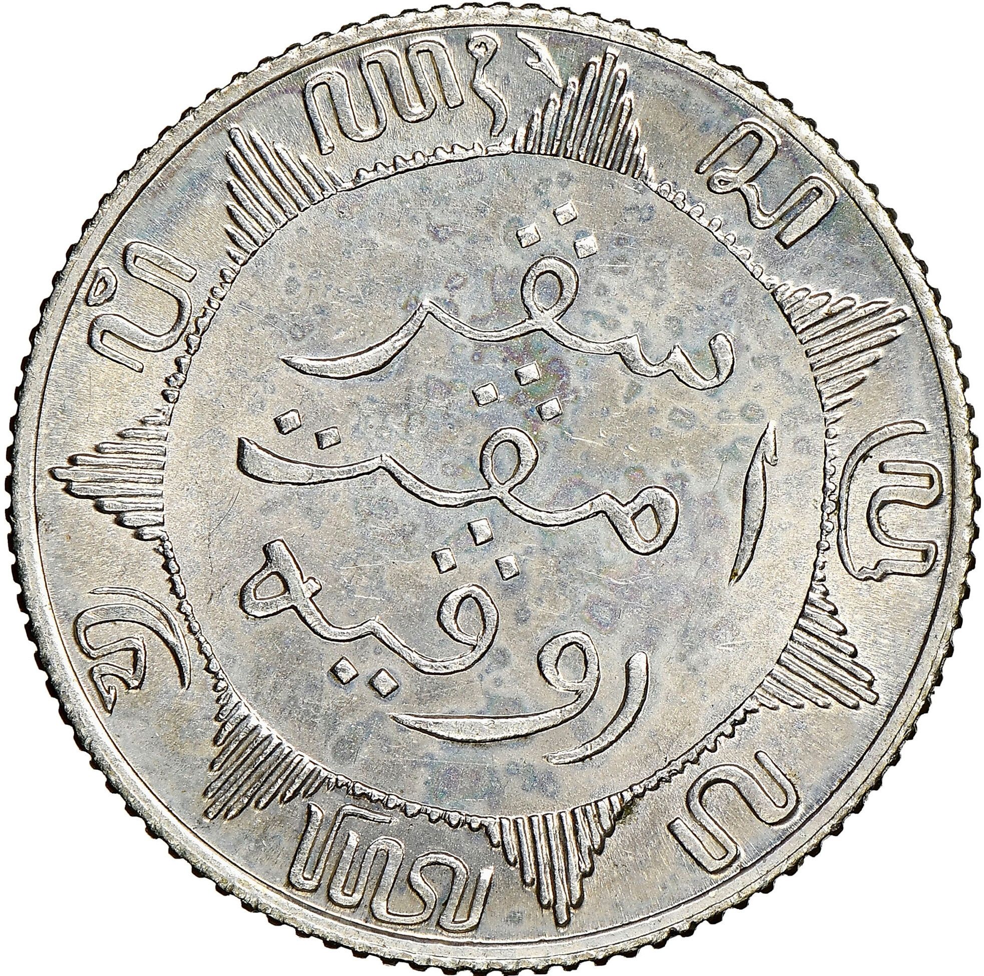 Опис: Сонячний диск із 7 променями. Номінал всередині диска в трьох рядках малайською мовою та між променями яванською мовою.