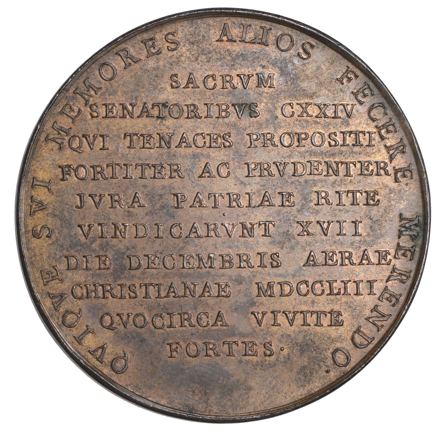 SACRVM SENATORIBVS CXXIV QVI TENACES PROPOSITI FORTITER AC PRVDENTER JVRA PATRIAE RITE VINDICARVNT XVII DIE DECEMBRIS AERAE CHRISTIANAE MDCCLIII QVOCIRCA VIVITE FORTES
