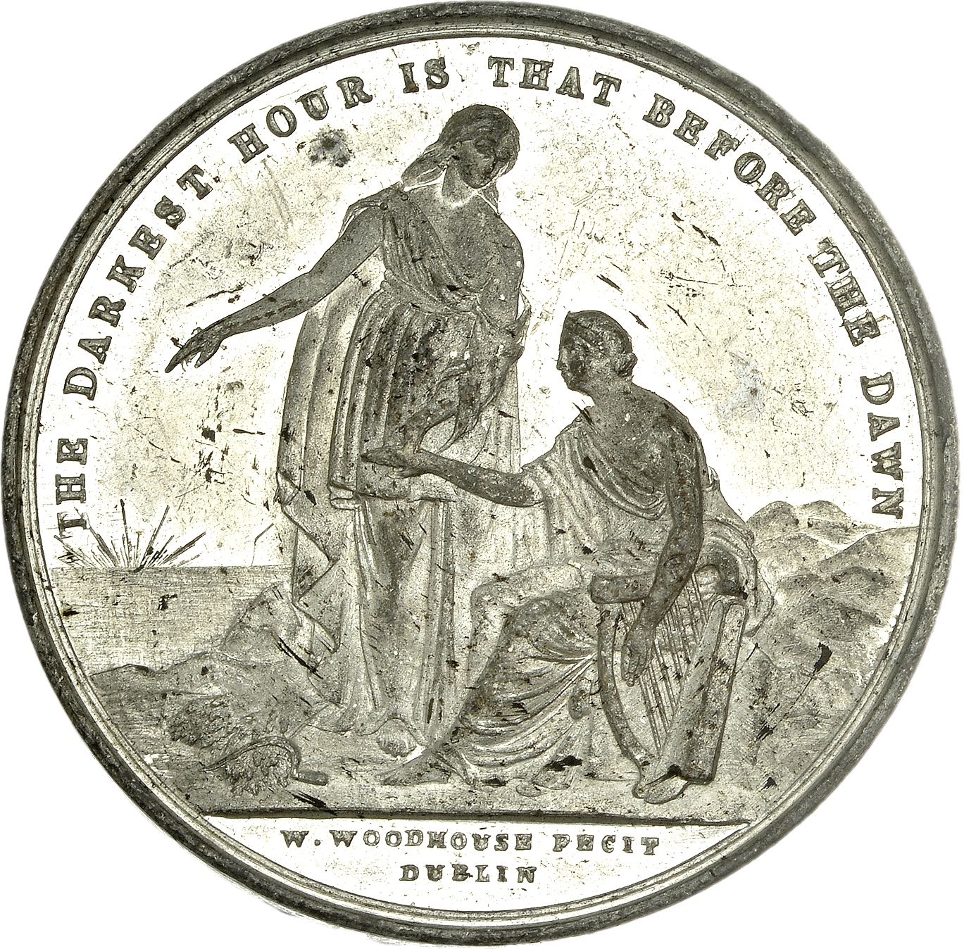 Опис: Стояча жіноча фігура Надії простягає руку до правої руки Гібернії. У лівій руці Гібернії — арфа.