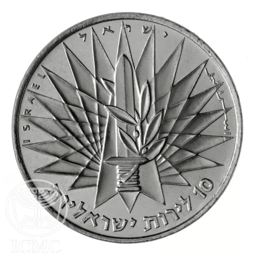 Опис: У центрі — емблема Збройних сил Ізраїлю на тлі стилізованої зірки. По верхньому краю, між променями зірки, слово «Ізраїль» арабською, івритом та англійською мовами. По нижньому краю — номінал «10 ізраїльських ліро» івритом на срібних монетах, на золотій монеті — «100 ізраїльських ліро».