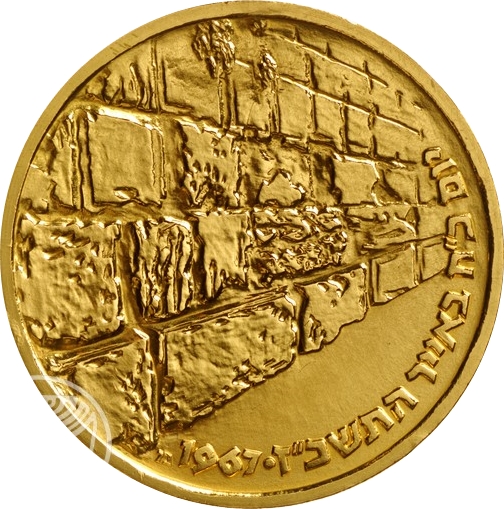 Гурт: На івриті на срібних і золотих монетах B.U. викарбувано опис «28-й день місяця ліар — 2-й день місяця сіван 5727», дати Шестиденної війни. Напис розташований на аверсі, до нього додано маленькі зірочки. На срібній монеті напис розташований на реверсі, до нього додано три маленькі ромби.
