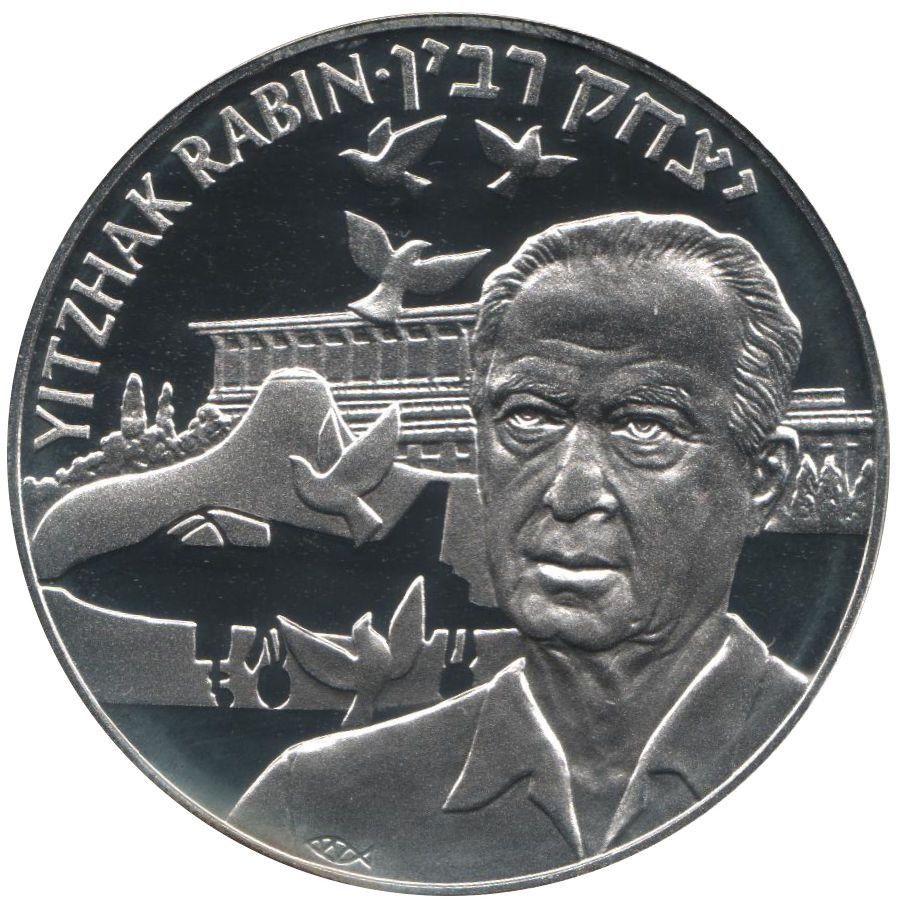 Опис: Бюст Іцхака Рабіна. 5 голубів у повітрі зліва. Зліва під лівим плечем — знак риби.