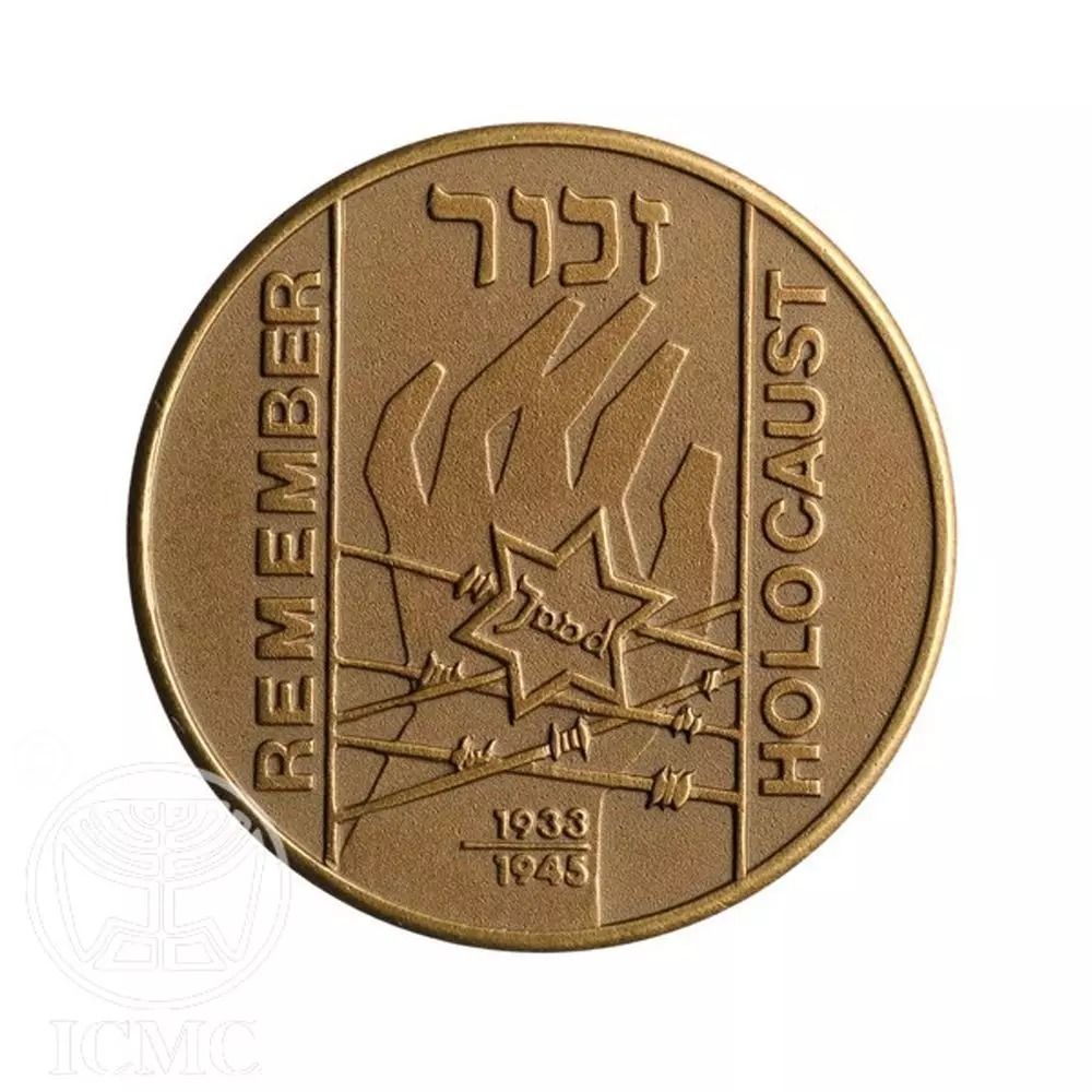 Опис: Простягнута рука та колючий дріт із зіркою Давида з написом «Jood» (єврей голландською мовою). Зверху — слово «пам'ятай» івритом, а знизу — дати «1933» та «1945». Праворуч — слово «REMEMBER» (ПАМ'ЯТАЙ), а ліворуч — слово «HOLOCAUST» (ГОЛОКОСТ).