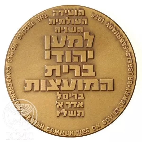 Опис: У центрі — напис «Друга світова конференція єврейських громад з питань радянських євреїв, Брюссель, 1 Адар 5736 року». На обідку — англійський переклад дати: «лютий 1976 року».