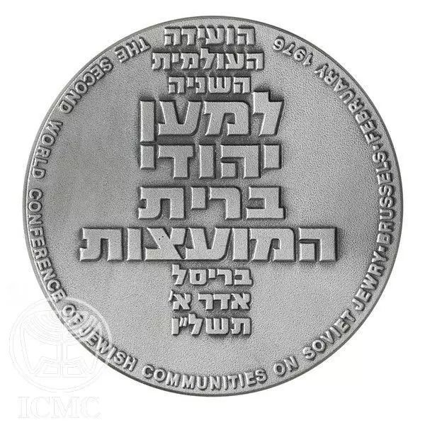 Опис: У центрі — напис «Друга світова конференція єврейських громад з питань радянських євреїв, Брюссель, 1 Адар 5736 року». На обідку — англійський переклад дати: «лютий 1976 року».