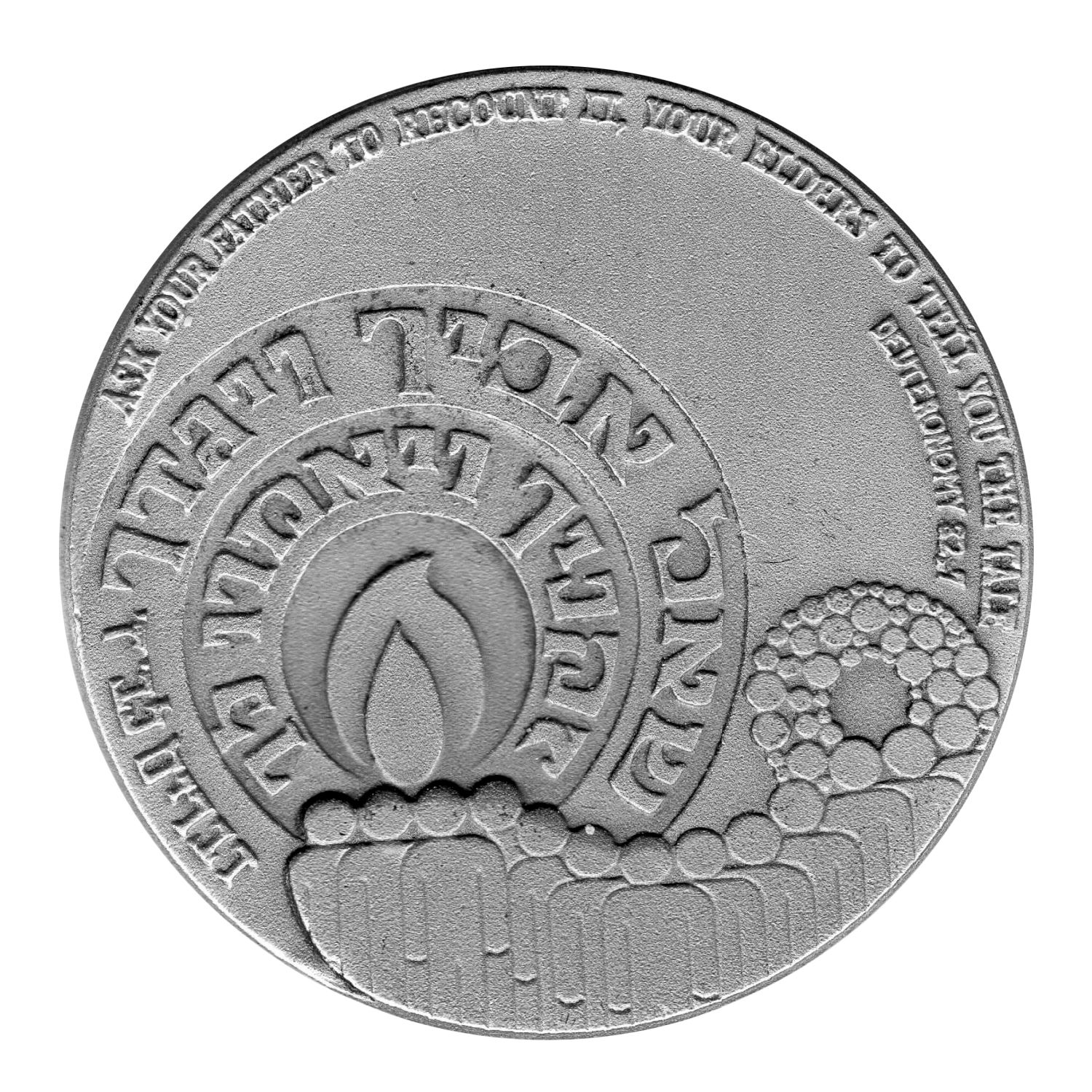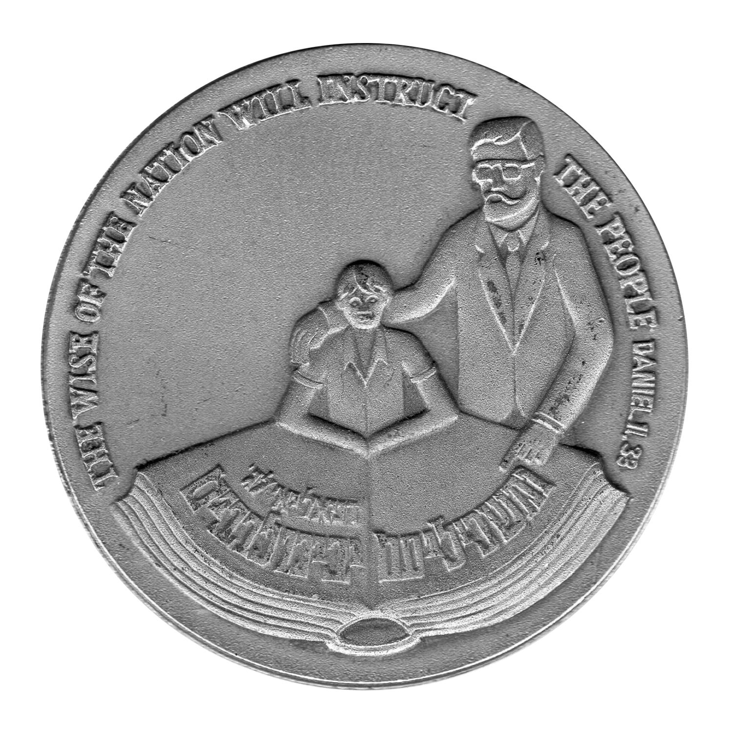 Опис: Запалена свічка, уривок з Біблії стилізованим шрифтом «Попросіть свого Отця розповісти вам, а старших — переказати вам цю історію» (Повторення Закону 32:7) англійською та івритом. У нижній частині медалі можна побачити зображення студентів.