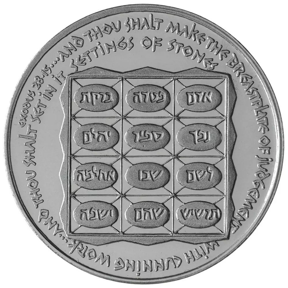 Опис: Дванадцять дорогоцінних каменів на нагруднику первосвященика та їхні імена на івриті: рубін, топаз, берил, бірюза, сапфір, діамант, опал, агат, аметист, смарагд, онікс, яшма. На облямівці вірш англійською мовою: «... І зробиш нагрудник суду майстерною роботою... і вставиш у нього камені... (Вихід 28:15).