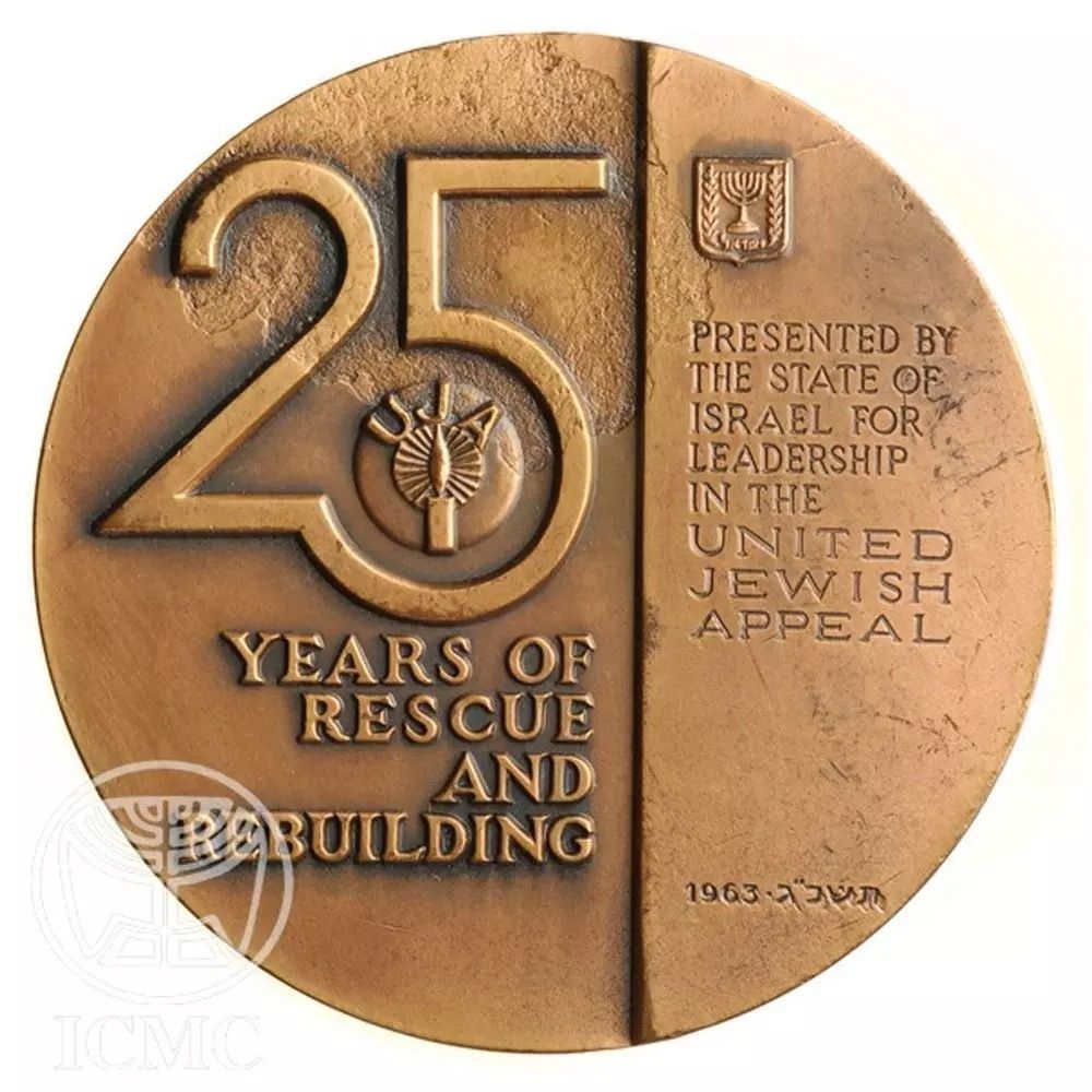 Опис: Зліва цифра «25». У центрі цифри — емблема U.J.A. разом із словами англійською мовою «роки порятунку та відбудови». Праворуч на рельєфній панелі — державна емблема, а під нею — напис англійською мовою «Подаровано Державою Ізраїль за лідерство в United Jewish Appeal». Нижче, праворуч, дата «5723-1963».