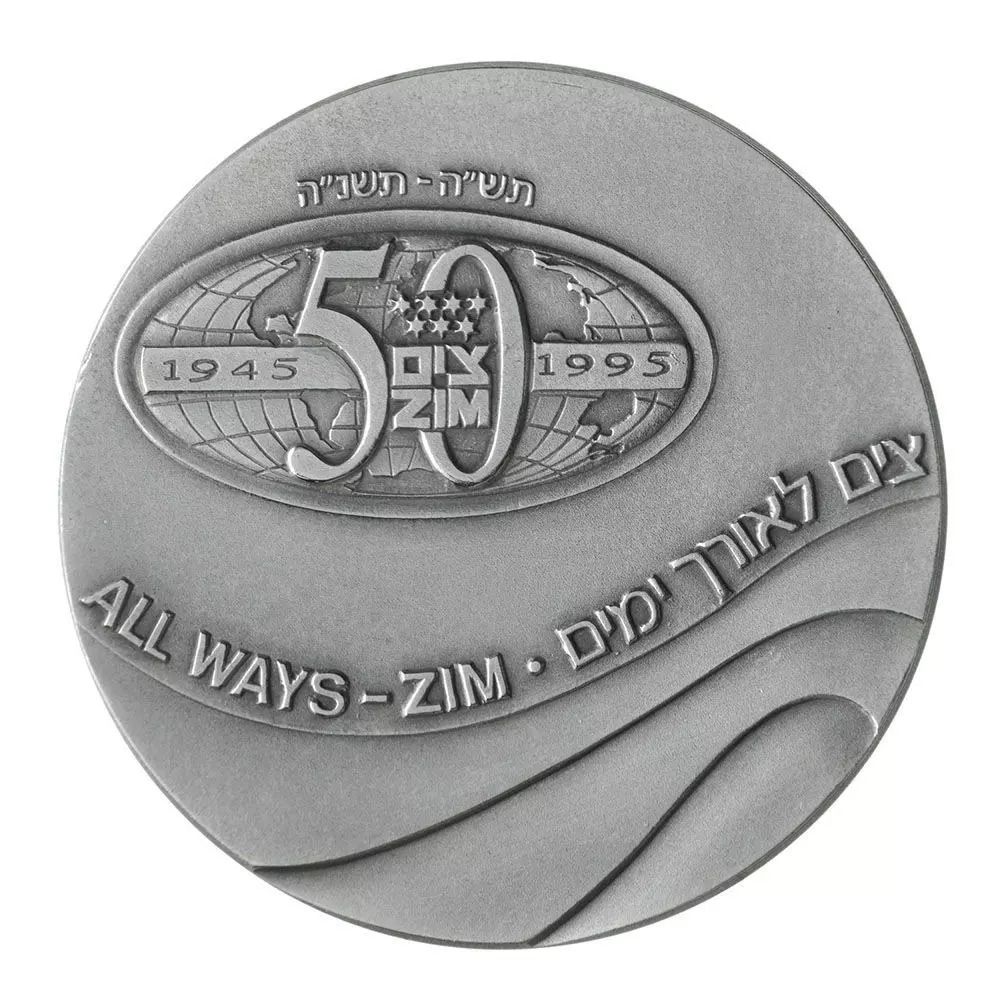 Опис: П'ятдесятирічний символ Зіму — земна куля з цифрою «50» у центрі, сім зірок, напис «Зім» на івриті та англійській мові та роки «1945-1995». Над символом — роки 5705-5755. Під символом — хвилясті лінії та напис «ALL WAYS-ZIM» на івриті та англійській мові.
