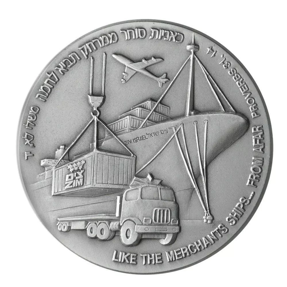 Опис: Вантажівка, кран, що підіймає контейнер, корабель і літак, на тлі штаб-квартири Zim. По периметру напис «Як кораблі купців... з далеких країв» з джерелом «Приповісті 31,14» на івриті та англійською мовою.