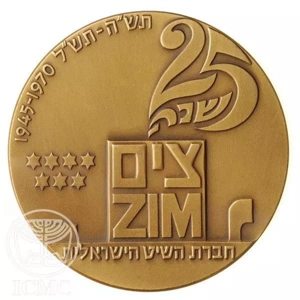 Опис: У центрі — стилізована фігура палуби корабля. З димаря з написом «Zim» виходить дим, що утворює слова «25th Anniversary» (25-та річниця). Ліворуч від слова «Zim» — сім зірок Давида (емблема Zim). По всій ширині палуби напис: «Israel Navigation Company». На верхньому краю монети дати «5705-5730, 1945-1970».