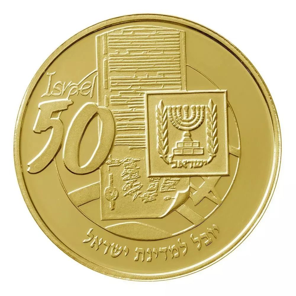 Опис: Сувій Декларації незалежності та президентський прапор; напис «Ізраїль» 50» та слова «50-та річниця Ізраїлю» на івриті вздовж нижнього краю.
