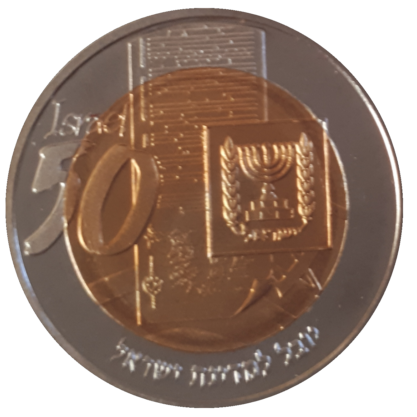 Опис: Сувій Декларації незалежності та президентський прапор; напис «Ізраїль» 50» та слова «50-та річниця Ізраїлю» на івриті вздовж нижнього краю.