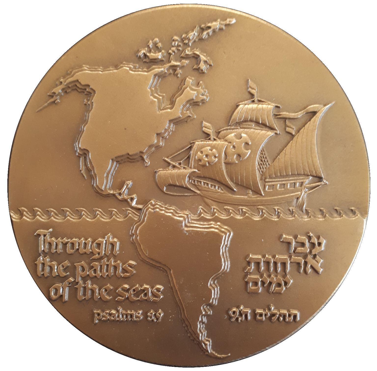 Опис: Корабель Колумба з розвіваючимися вітрилами входить у Мексиканську затоку. Карта американського континенту. У нижній частині напис «Шляхами морів» та його джерело «Псалми 8:9» на івриті та англійською мовою.