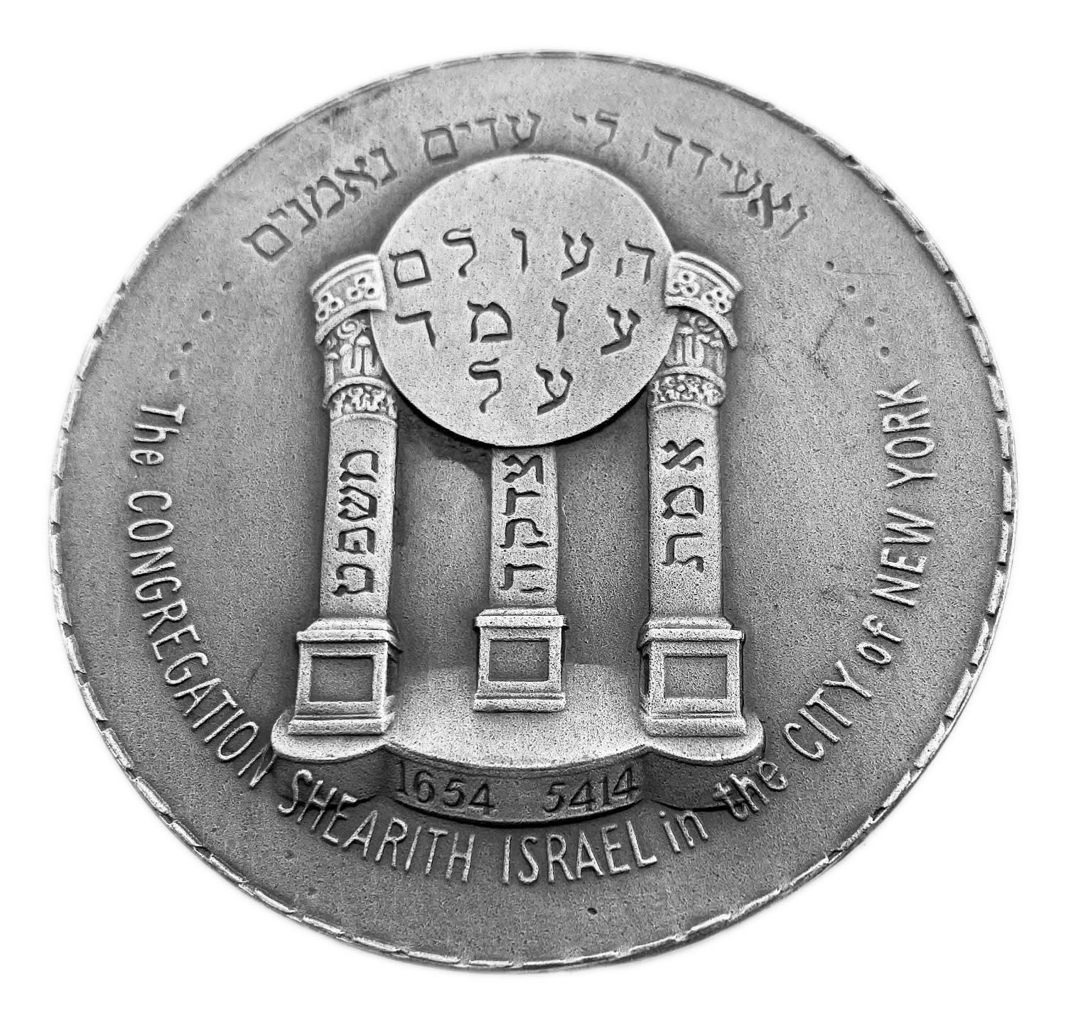 Опис: Зверху — напис на івриті: «І я покличу вірних свідків». У центрі — емблема конгрегації «Шеаріт Ісраель», заснованої в 1654 році. Емблема зображує три стовпи — «Справедливість, Праведність та Істина» — та напис «Світ стоїть на» (трьох стовпах). Внизу — дата: «5414-1654» та англійський напис: «Громада «Шеаріт Ісраель» у місті Нью-Йорк».