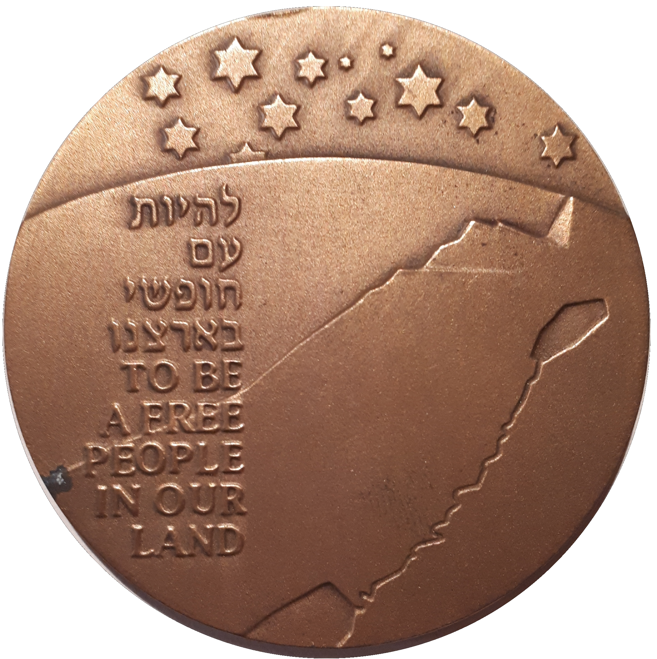 Опис: Супутникова фотографія Землі Ізраїлю із зірками на тлі вгорі. Зліва напис «БУТИ ВІЛЬНИМ НАРОДОМ НА НАШІЙ ЗЕМЛІ» на івриті та англійській мові.