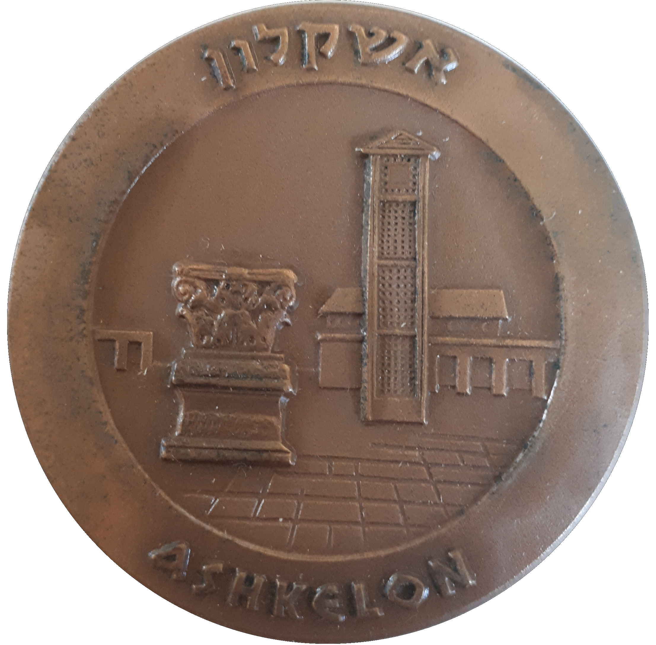 Опис: У центрі — репліка античної бронзової монети Ашкелона. На ній зображено ніс судна та весла. Над моделлю судна — грецька літера, що скорочує слово «Ашкелон». Нижче — літери, що позначають рік 57 за новим календарем міста (47 р. до н. е.). На верхньому краї медалі напис: «Монета Ашкелона 47 р. до н. е.», 3713 на івриті.