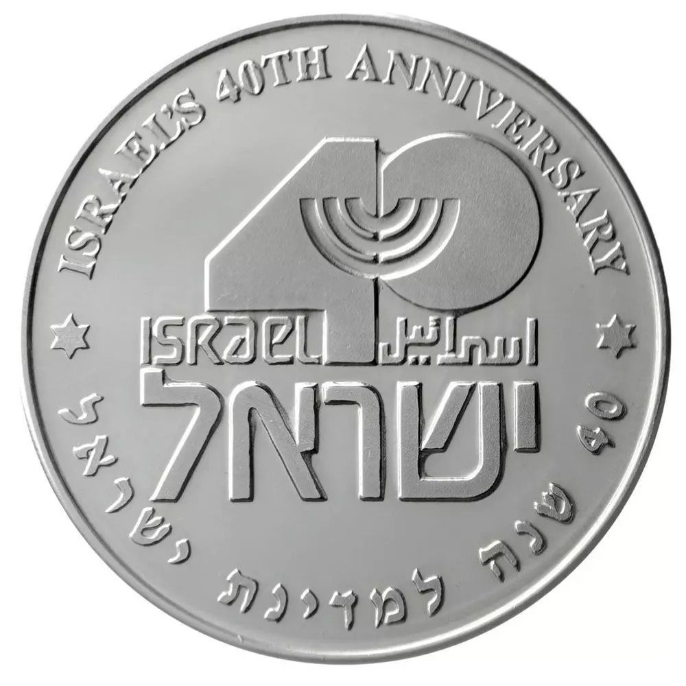 Опис: Емблема 40-ї річниці зі стилізованою менорою. Внизу слово «Ізраїль» на івриті, латиницею та арабськими літерами. По колу слова «ISRAEL'S 40th ANNIVERSARY» (40-та річниця Ізраїлю) на івриті та англійською мовою, розділені зірками Давида.