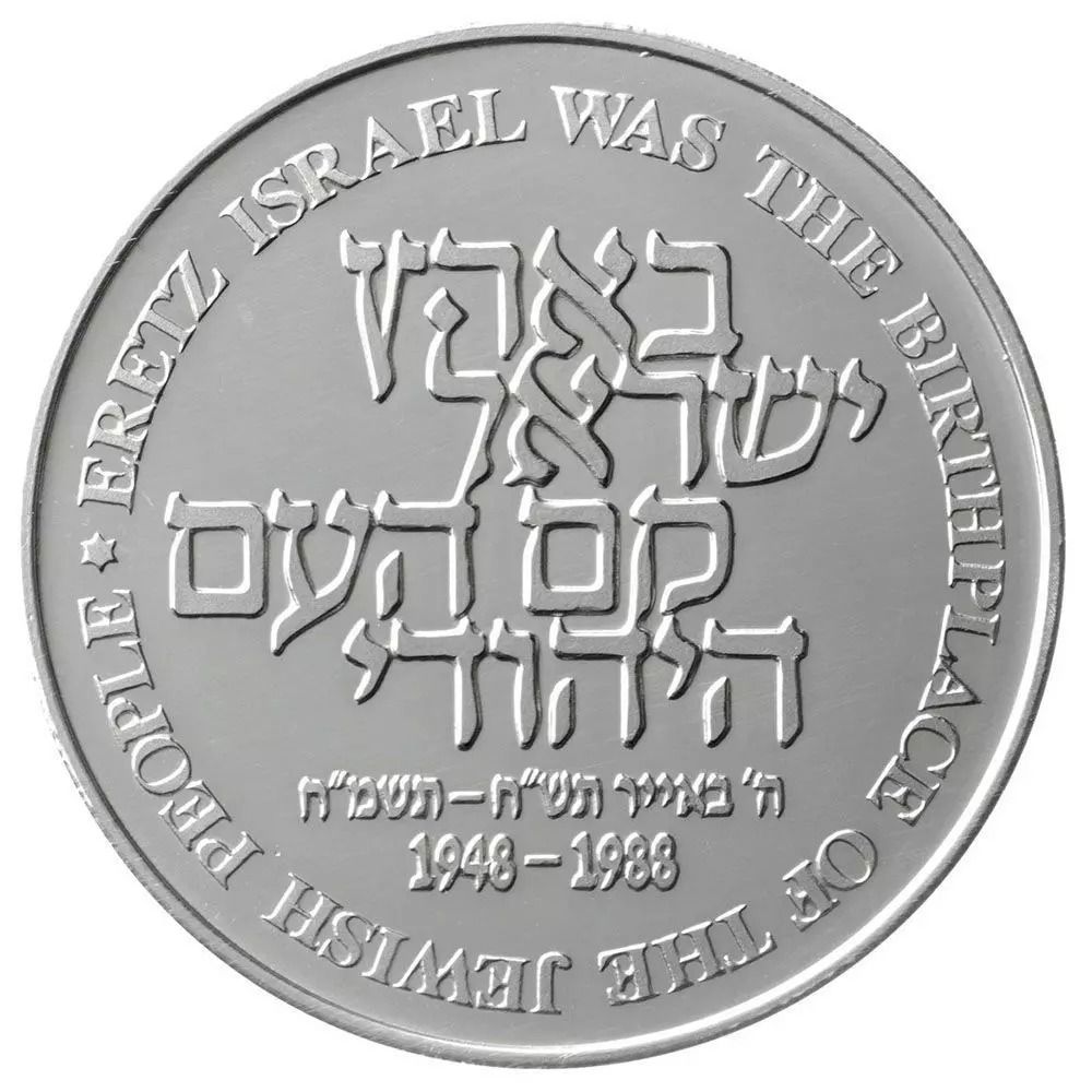 Опис: По периметру монети розміщено напис «ЕРЕЦ ІСРАЕЛЬ БУВ МІСЦЕМ НАРОДЖЕННЯ ЄВРЕЙСЬКОГО НАРОДУ» (з Декларації незалежності) із зіркою Давида в кінці напису. Той самий цитат на івриті розміщено в центрі, з датою «5 ліар 5708-5748» на івриті та роками «1948-1988» під нею.
