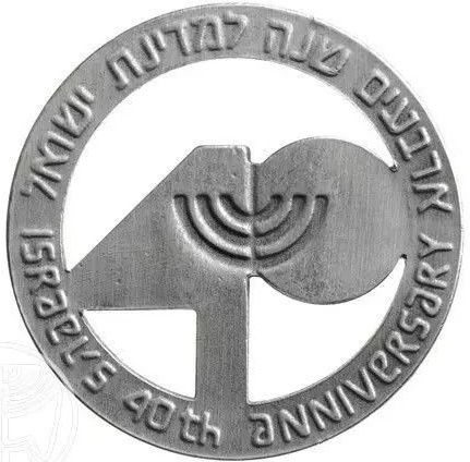 Опис: Емблема 40-ї річниці зі стилізованою менорою. По периметру напис «40-та річниця Ізраїлю» на івриті та англійською мовою.