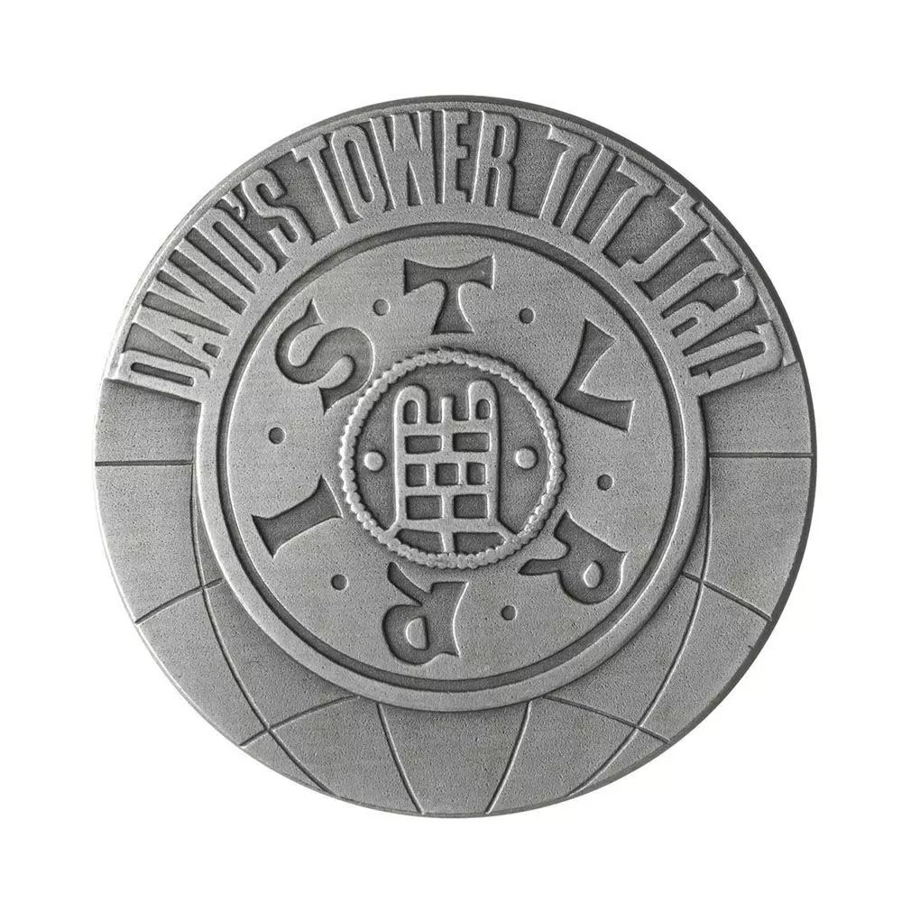 Опис: У центрі — репліка монети хрестоносців Єрусалиму 11 століття. Напис, що означає «вежа», стосується малюнка, зображеного на монеті хрестоносців. Навколо — напис: «Вежа Давида» на івриті та англійській мові.