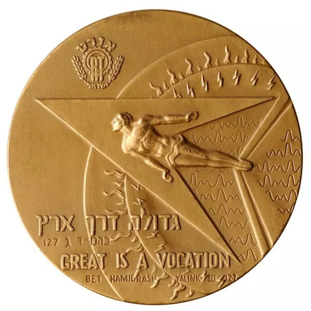 Опис: У центрі, над емблемою ORT. У правій частині медалі зображено сонце, що світить. З променів виходять фігури, що символізують предмети, які викладаються в школах ORT, такі як електрика, електроніка, механіка та металургія. З усіх символів видніється фігура молодого чоловіка, що стрибає вперед. Нижче розміщено напис на івриті: «Велике покликання». Далі наведено англійський переклад із зазначенням джерела «Bet Hamidrash Yalink 111:127».