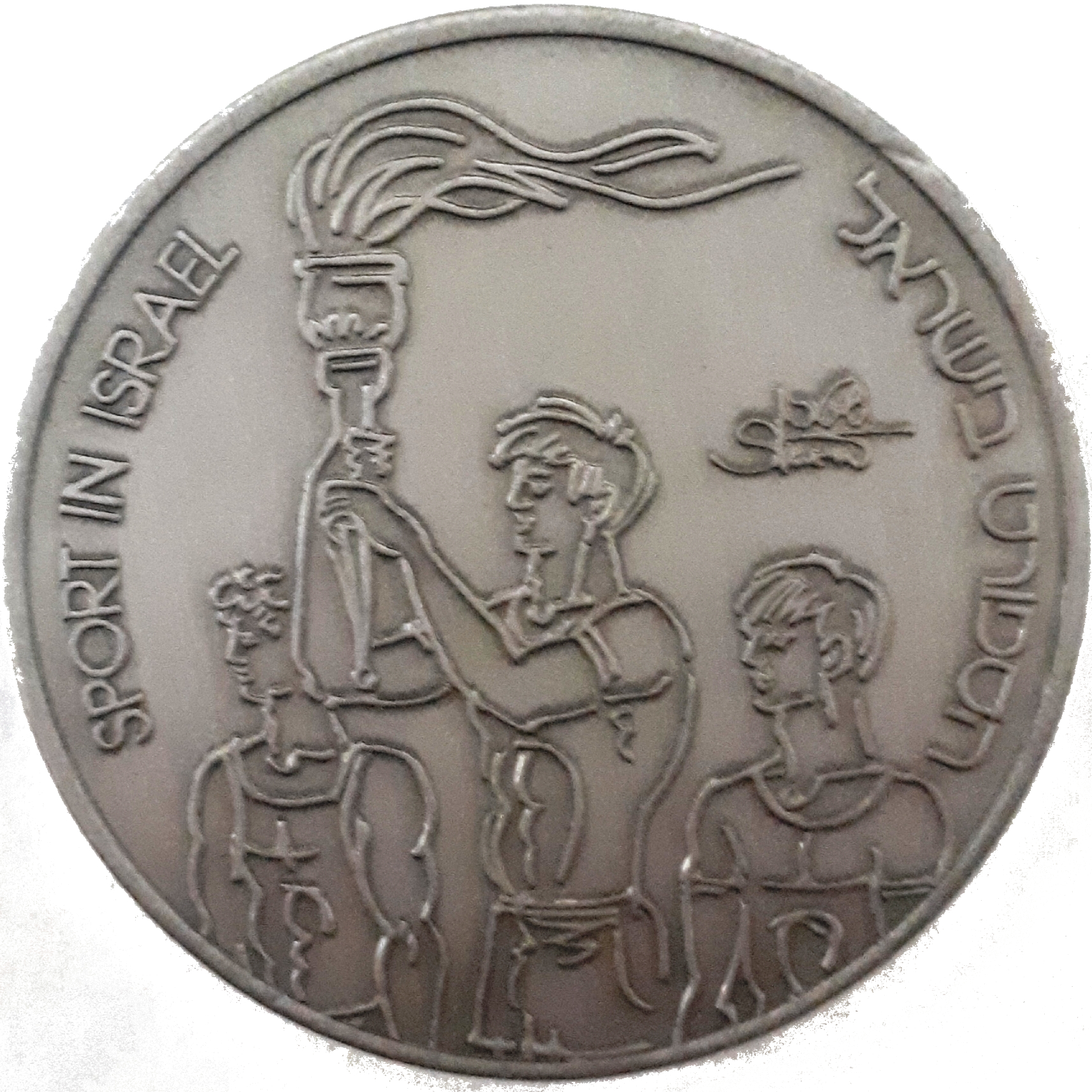 Опис: Три фігури, центральна з яких тримає факел, з підписом художника праворуч. Праворуч, по колу, слова «SPORT IN ISRAEL» (Спорт в Ізраїлі) на івриті, а ліворуч — англійською мовою.