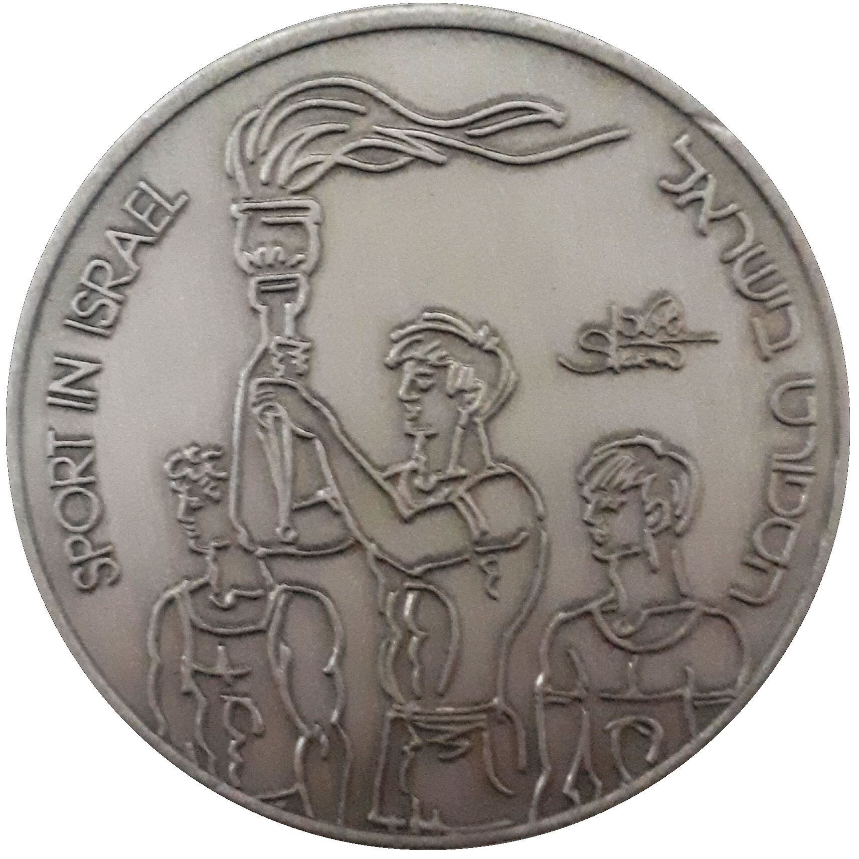 Опис: Три фігури, центральна з яких тримає факел, з підписом художника праворуч. Праворуч, по колу, слова «SPORT IN ISRAEL» (Спорт в Ізраїлі) на івриті, а ліворуч — англійською мовою.