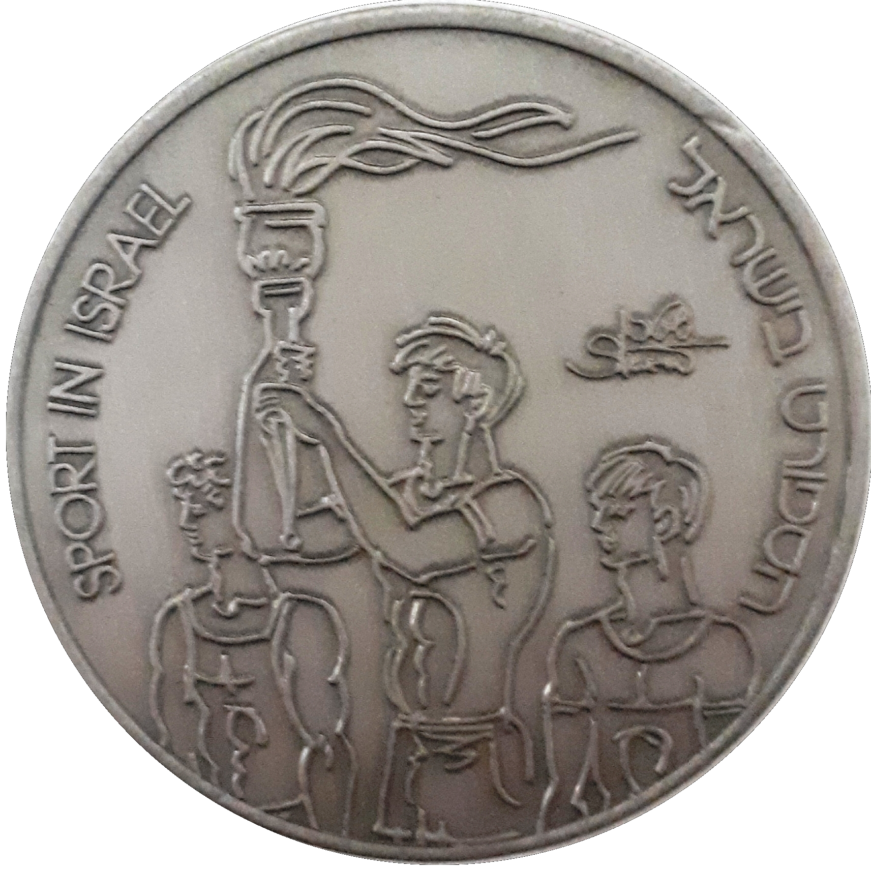 Опис: Три фігури, центральна з яких тримає факел, з підписом художника праворуч. Праворуч, по колу, слова «SPORT IN ISRAEL» (Спорт в Ізраїлі) на івриті, а ліворуч — англійською мовою.