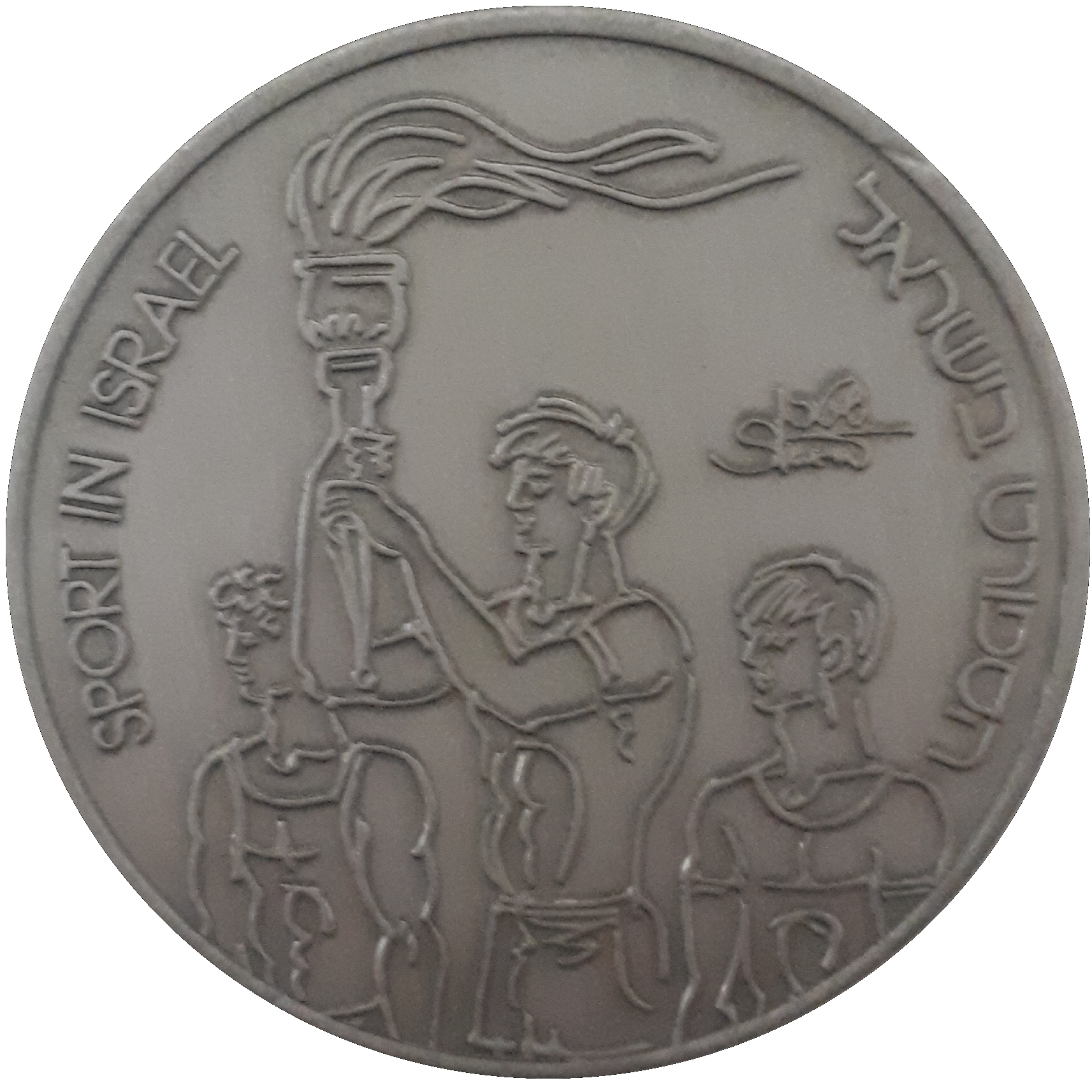 Опис: Три фігури, центральна з яких тримає факел, з підписом художника праворуч. Праворуч, по колу, слова «SPORT IN ISRAEL» (Спорт в Ізраїлі) на івриті, а ліворуч — англійською мовою.
