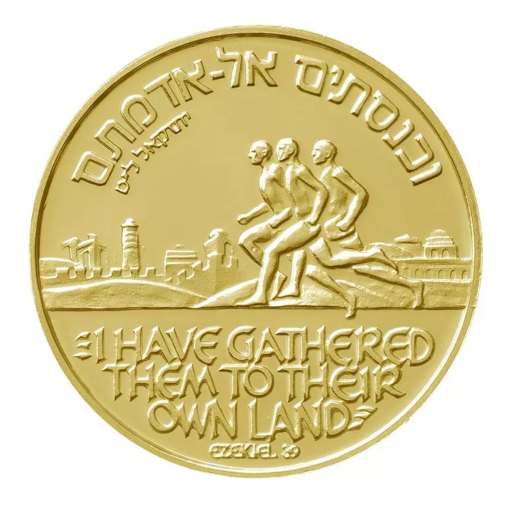 Опис: Троє бігунів на тлі Єрусалима. Напис «Я ЗІБРАВ ЇХ НА ЇХНЮ ЗЕМЛЮ» та джерело «ЕЗЕКІЄЛЬ 39» з’являються на івриті по периметру зверху та англійською мовою в нижній частині медалі.