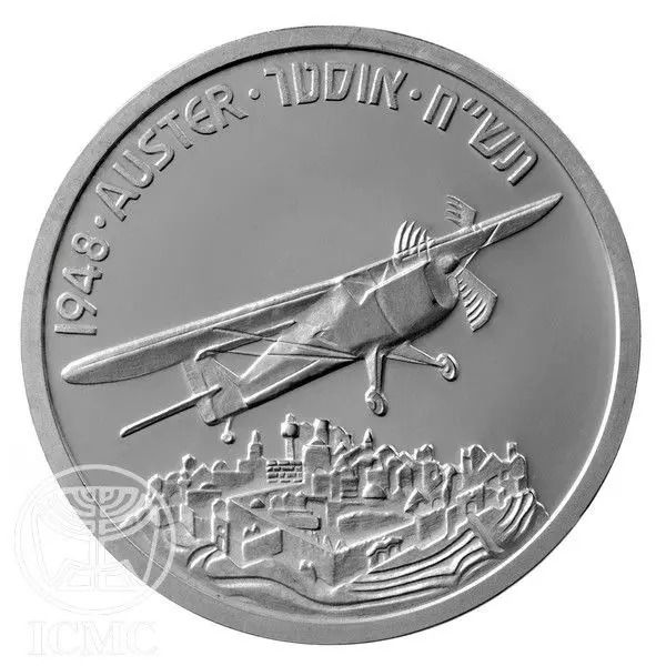 Опис: Літак Auster A.O.P3 у польоті з переважно символічним видом, що підкреслює ряд характерних будівель Єрусалиму з характерною стіною, що прикрашає місто.