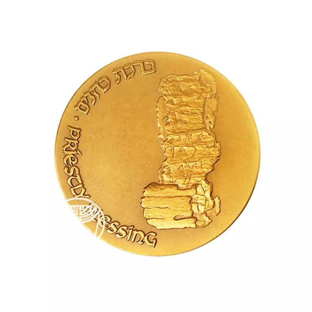 Опис: Срібна табличка з вигравіруваним благословенням священиків з періоду Першого Храму (7 століття до н. е.) стародавньою гебрейською писемністю та словами «Благословення священиків» гебрейською та англійською мовами. На золотих медалях діаметром 12,5 мм і 14 мм зображено державний герб, слово «ІЗРАЇЛЬ» та символ вмісту металу відповідно до стандартів Ізраїльського бюро стандартів: золото 585 у медалі діаметром 12,5 мм і золото 750 у медалі діаметром 14 мм.