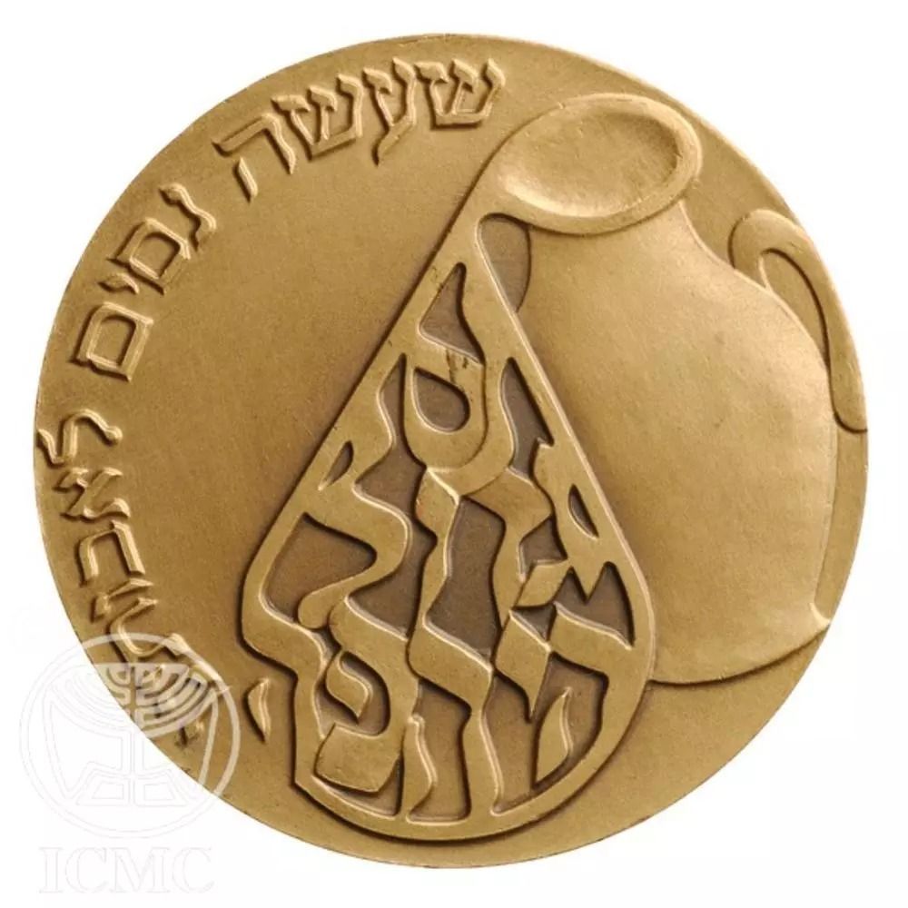 Опис: Флакон з олією, з якого виливається крапля. На лампі є напис на івриті: «Тут сталося велике диво». По колу є напис на івриті: «Який творив дива для наших предків».