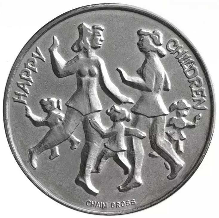 Опис: Відома скульптура Хаїма Гросса, що зображує танцюючих дітей. По обидва боки статуї, по колу, написано назву скульптури «ЩАСЛИВІ ДІТИ». Нижче — ім'я художника «CHAIM GROSS». Зворотний бік золотих медалей діаметром 12,5 мм і 14 мм схожий на зворотний бік медалі «День весілля» — рука, що тримає букет, складений з єврейських літер «з любов'ю».