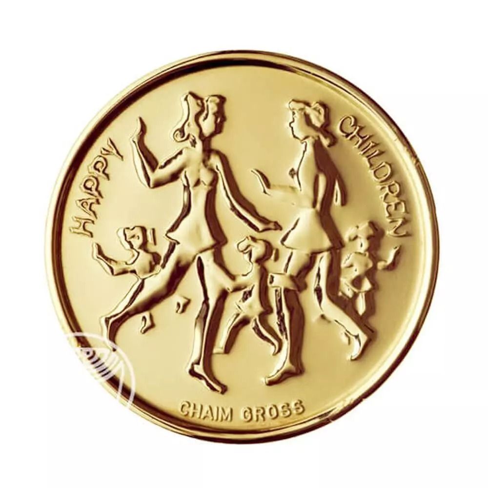 Опис: Відома скульптура Хаїма Гросса, що зображує танцюючих дітей. По обидва боки статуї, по колу, написано назву скульптури «ЩАСЛИВІ ДІТИ». Нижче — ім'я художника «CHAIM GROSS». Зворотний бік золотих медалей діаметром 12,5 мм і 14 мм схожий на зворотний бік медалі «День весілля» — рука, що тримає букет, складений з єврейських літер «з любов'ю».