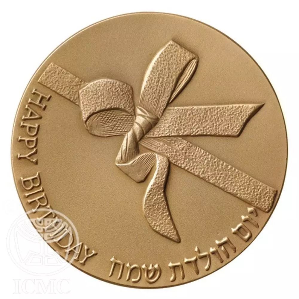 Опис: Бант, що символізує подарунок на день народження, та слова «HAPPY BIRTHDAY» (З ДНЕМ НАРОДЖЕННЯ) на івриті та англійській мові.