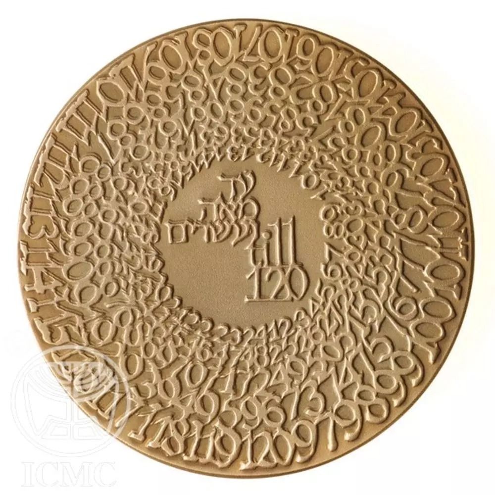 Опис: Слова «до 120», традиційне єврейське побажання на день народження, на івриті та англійською мовою. На бронзовій медалі напис оточений концентричними колами з цифрами від 1 до 120. На срібній та золотій медалях праворуч від напису зображено букет квітів.