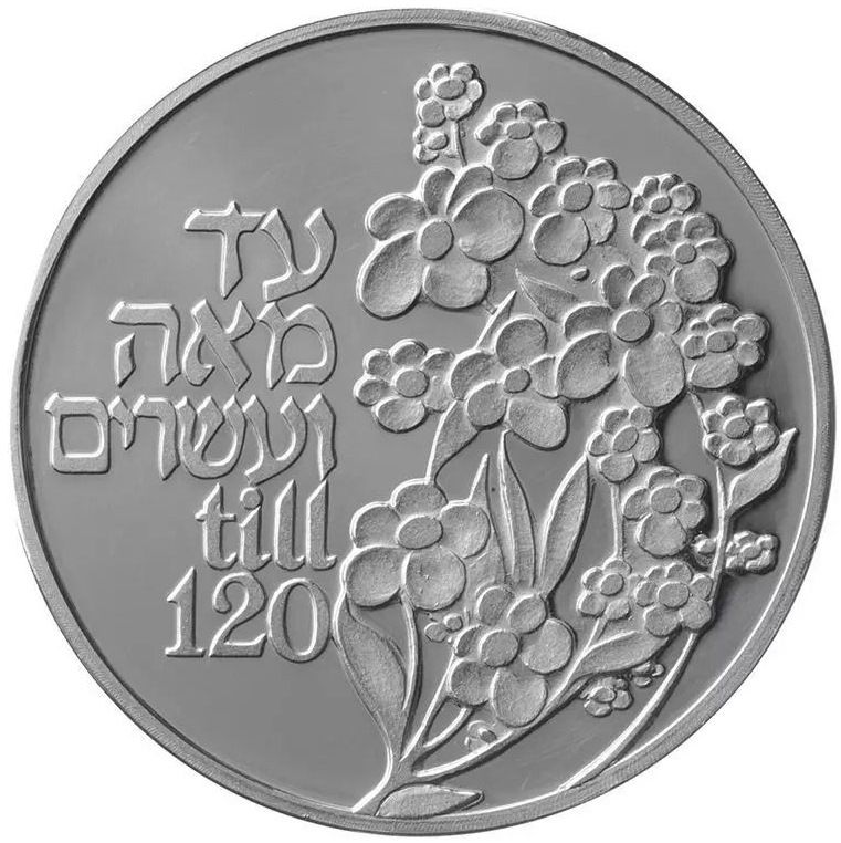 Опис: Слова «до 120», традиційне єврейське побажання на день народження, на івриті та англійською мовою. На бронзовій медалі напис оточений концентричними колами з цифрами від 1 до 120. На срібній та золотій медалях праворуч від напису зображений букет квітів.