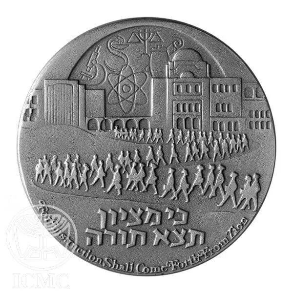 Опис: Фігури студентів, які входять до будівлі на горі Скопус. На задньому плані, над будівлями, символи різних дисциплін. Під легендою: «Бо з Сіону вийде закон», на івриті та англійською мовою.