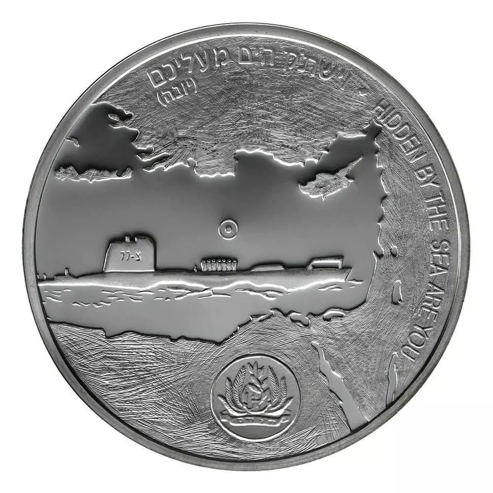 Опис: Підводний човен «Дакар» у морі в межах Середземного моря. Місце, де було знайдено уламки, позначено точкою в центрі. У правому куті напису: «Ти схований у морі», а в центрі — вірш з Книги Йони на івриті «І море заспокоїться для тебе». Внизу — емблема ВМС Ізраїлю.