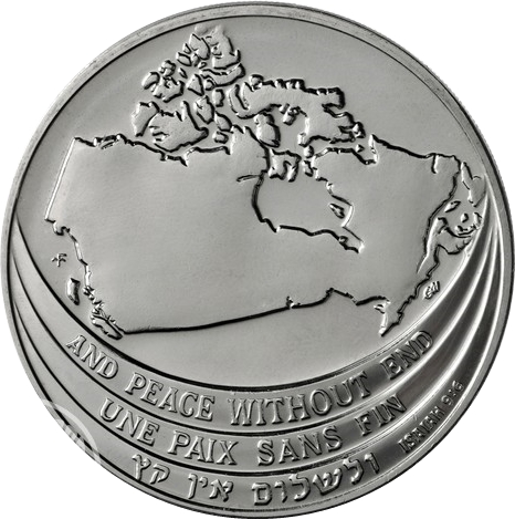 Опис: Зверху — рельєфна карта Канади. Внизу, у вигляді безперервного руху, з’являються слова: «І мир без кінця» (Ісая 9:6) на івриті, французькій та англійській мовах.