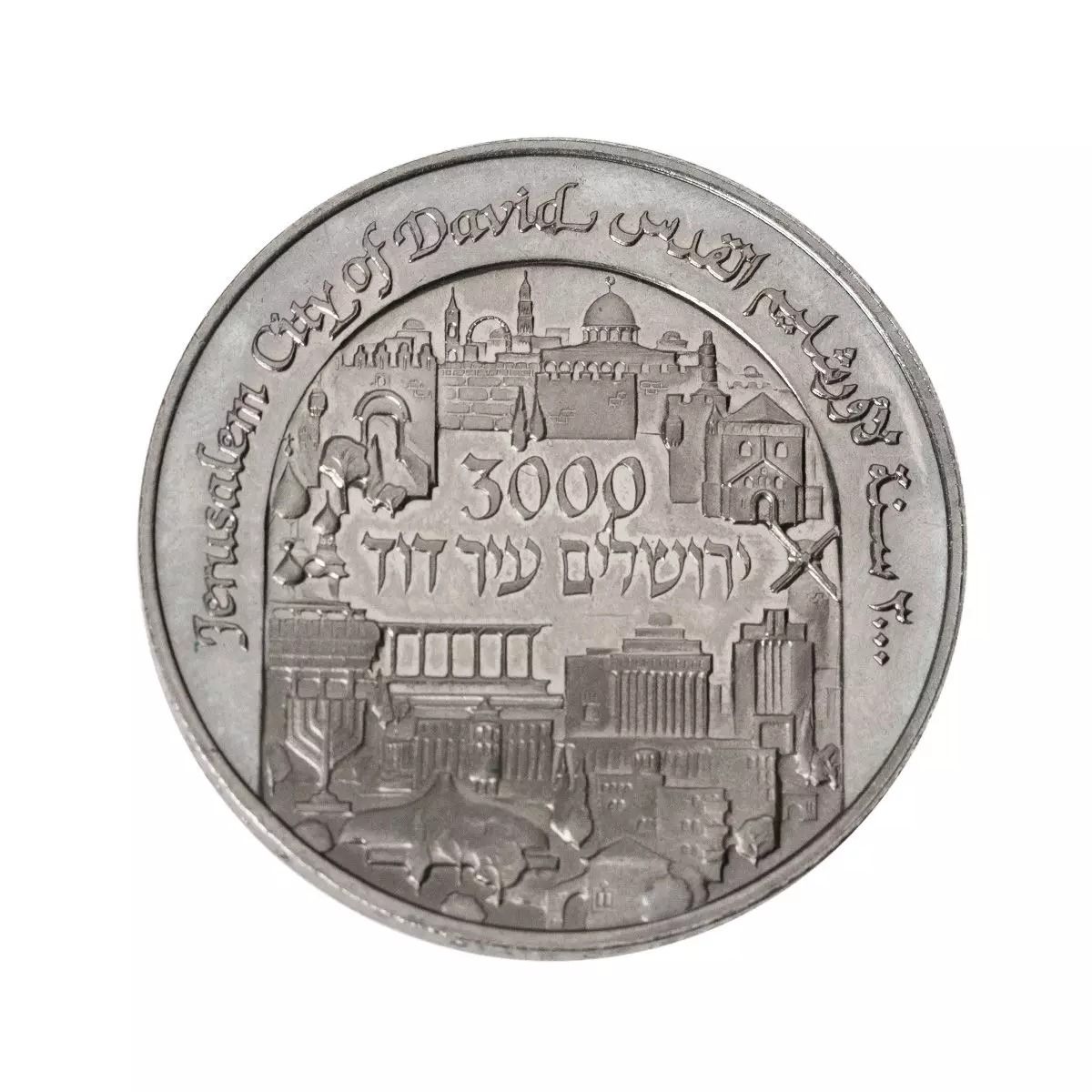 Опис: Панорамний вид старого та нового Єрусалима з написом «3000» та «Єрусалим, місто Давида» на івриті в центрі, а також англійською та арабською мовами по верхньому колу.